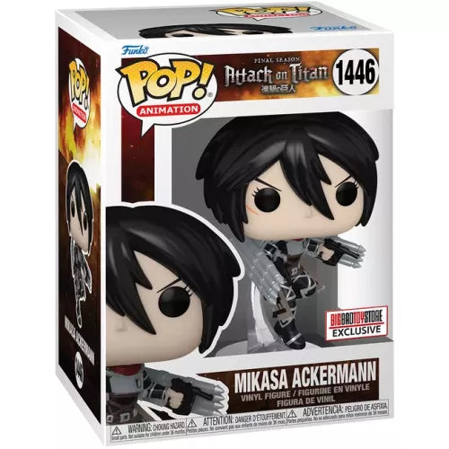 This POP! showcases Mikasa Ackermann mid-action, with an intense, focused expression and signature black hair falling sharply over her eyes. The figure faithfully recreates her Attack on Titan Final Season outfit, featuring the tactical gear and maneuvering equipment that defined her appearance. Her pose, as if leaping into battle, is supported by a clear stand, highlighting movement and bringing the character to life in any display. Each detail is carefully sculpted, from the bold lines on her jacket to the distinct metallic elements on her maneuvering gear.