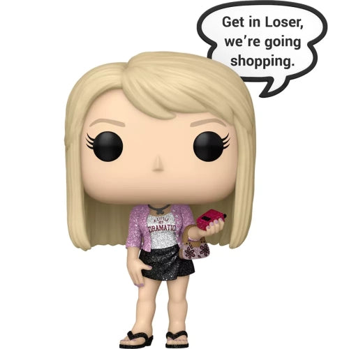 Introducing the Regina Funko POP! #1764, part of the exclusive Diamond Collection. This striking collectible captures Regina's unforgettable persona from the iconic Mean Girls movie. With its shimmering detail and confident pose, this piece stands out in any collector’s lineup, making it a must-have for fans of timeless teen comedy classics. Regina is depicted wearing a stylish ensemble featuring a glittery pink cardigan and black mini skirt, complete with her signature flip-flops and an unmistakable expression of cool detachment. She holds a phone in her hand, embodying her icon status, and the speech bubble firmly declares her memorable line from Mean Girls, "Get in Loser, we're going shopping," adding a touch of nostalgia for long-time fans.