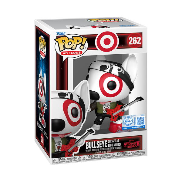 Target icon POP! Bullseye is rockin’ out as Eddie Munson! Bullseye has been Target’s official spokes-pup since 1999. He’s the life of the party wherever he goes, from store openings to award shows to Hollywood red-carpet events. He might just be the world’s most loveable bull terrier. Collect the exclusive POP! Bullseye as Dressed as Eddie Munson and add him to your Stranger Things collection! Vinyl figure is approximately 3.9 in (9.9 cm) tall.